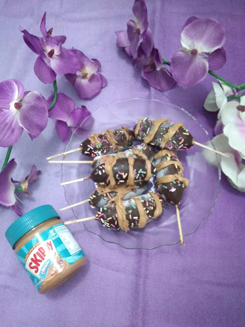 Nah...saat ini saya ingin membuat Es Pisang Coklat Selai Kacang Skippy. Es pisang coklat ini juga salah satu kegemaran anak saya. setiap pulang sekolah dan kuliah anak saya selalu mencari es pisang ini di kulkas. Mereka bisa habis 4-5 tusuk sekali makan. Kebayang kan berapa banyak es pisang yang harus saya buat.
