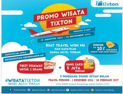 Ketika anda membeli hotel yang ditawarkan di Tixton dari fitur Travel Wish, anda berkesempatan memenangkan tiket pesawat untuk 2 orang ke Airport terdekat dari hotel tujuan. Juga ada uang tunai Rp 5 juta sebagai uang saku perjalanan. Periode perjalanan untuk 1 Desember sampai 28 Februari 2017.